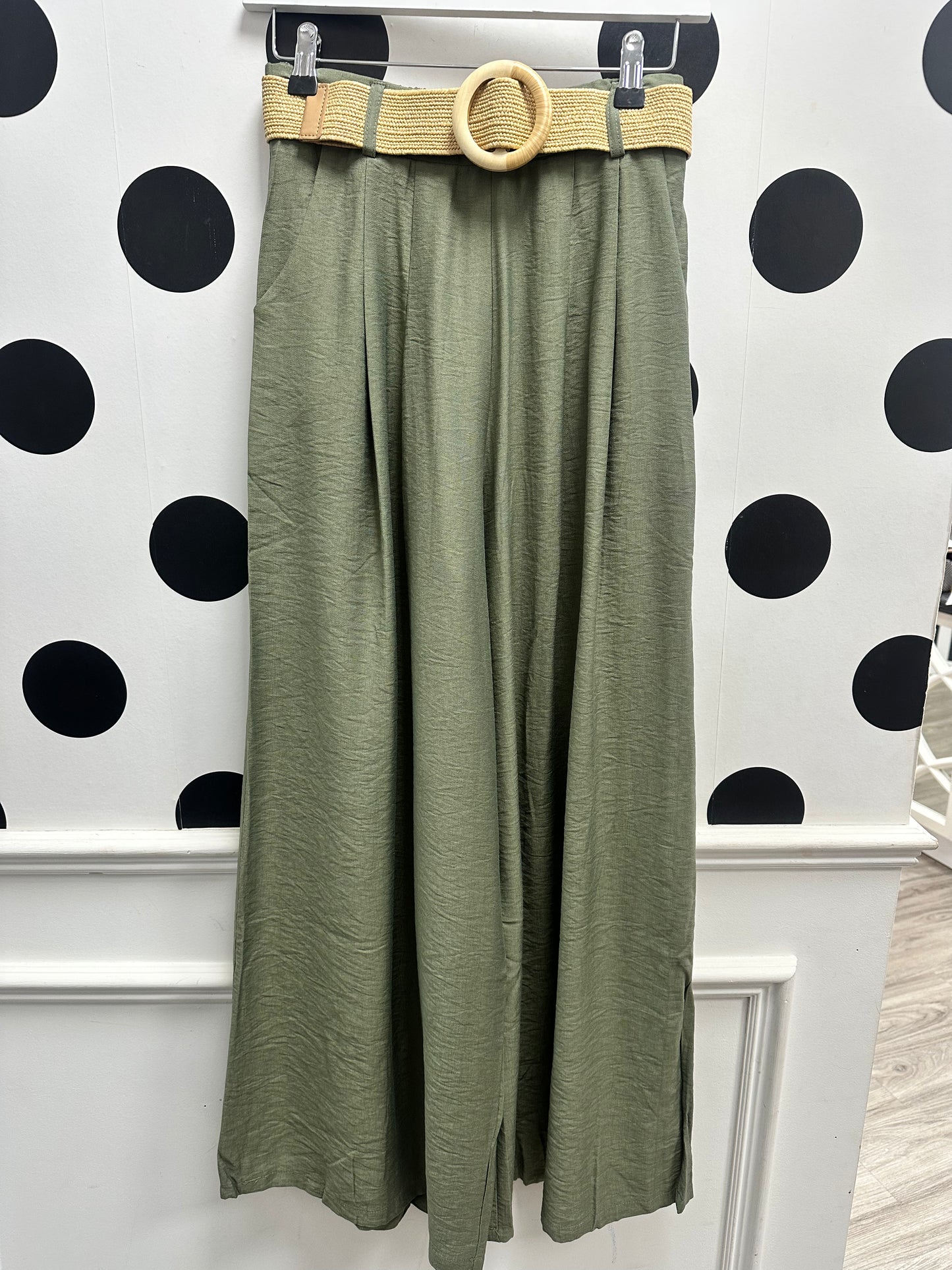 Lightweight wide leg trousers with elasticated waist and straw belt.