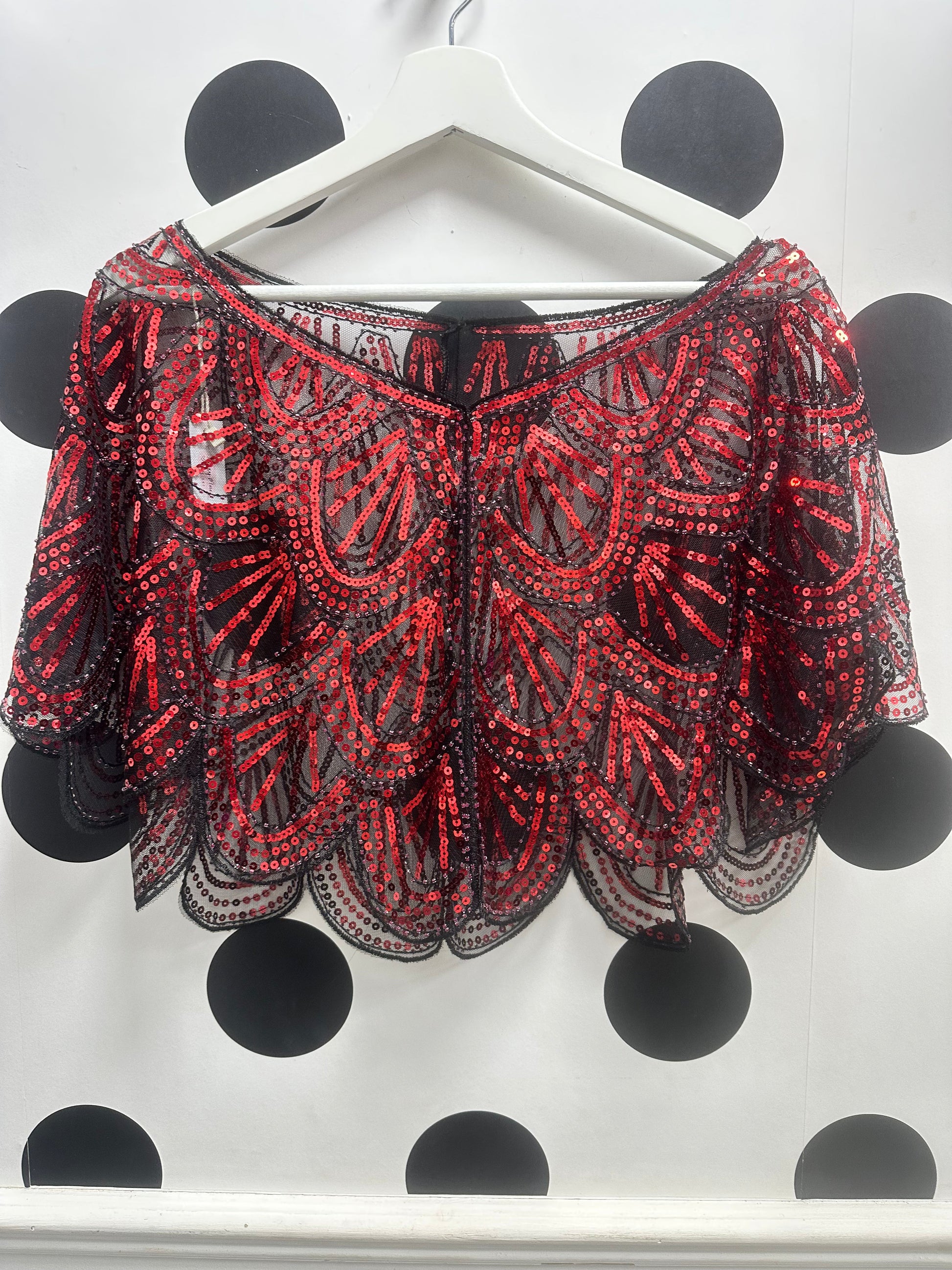 Vintage style sequin bolero cape with hook and eye fastening at the front.