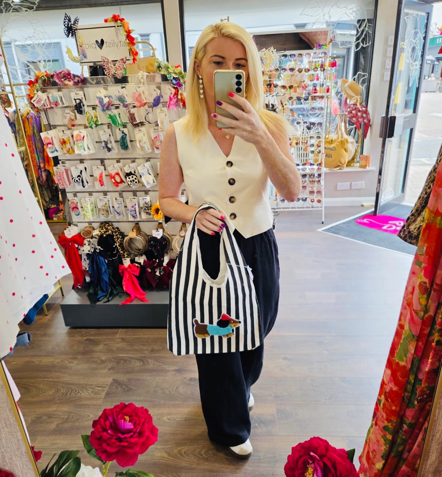 DMB Black Stripe Shoulder Sausage Dog Tote