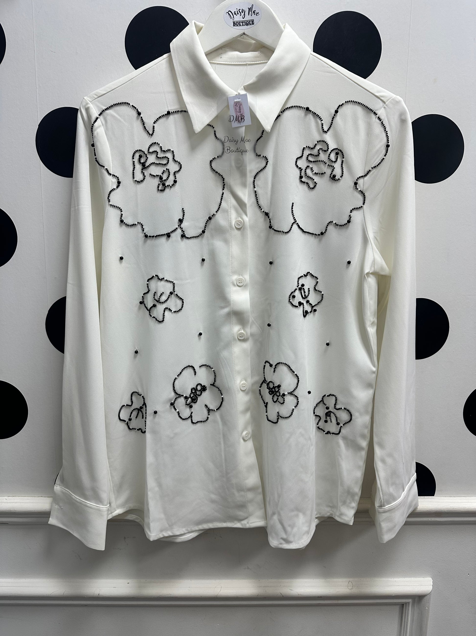Shirt with beaded flower pattern.