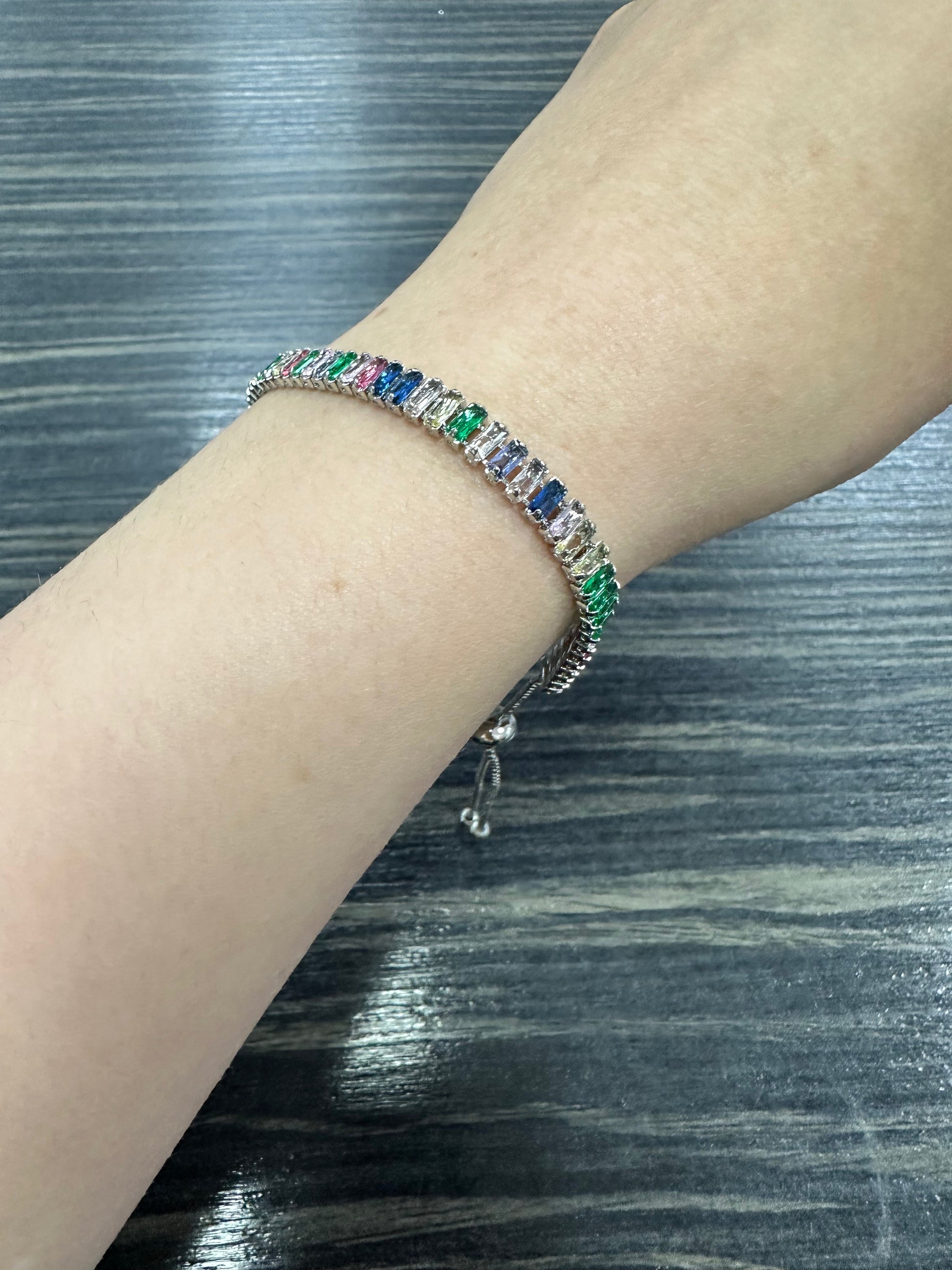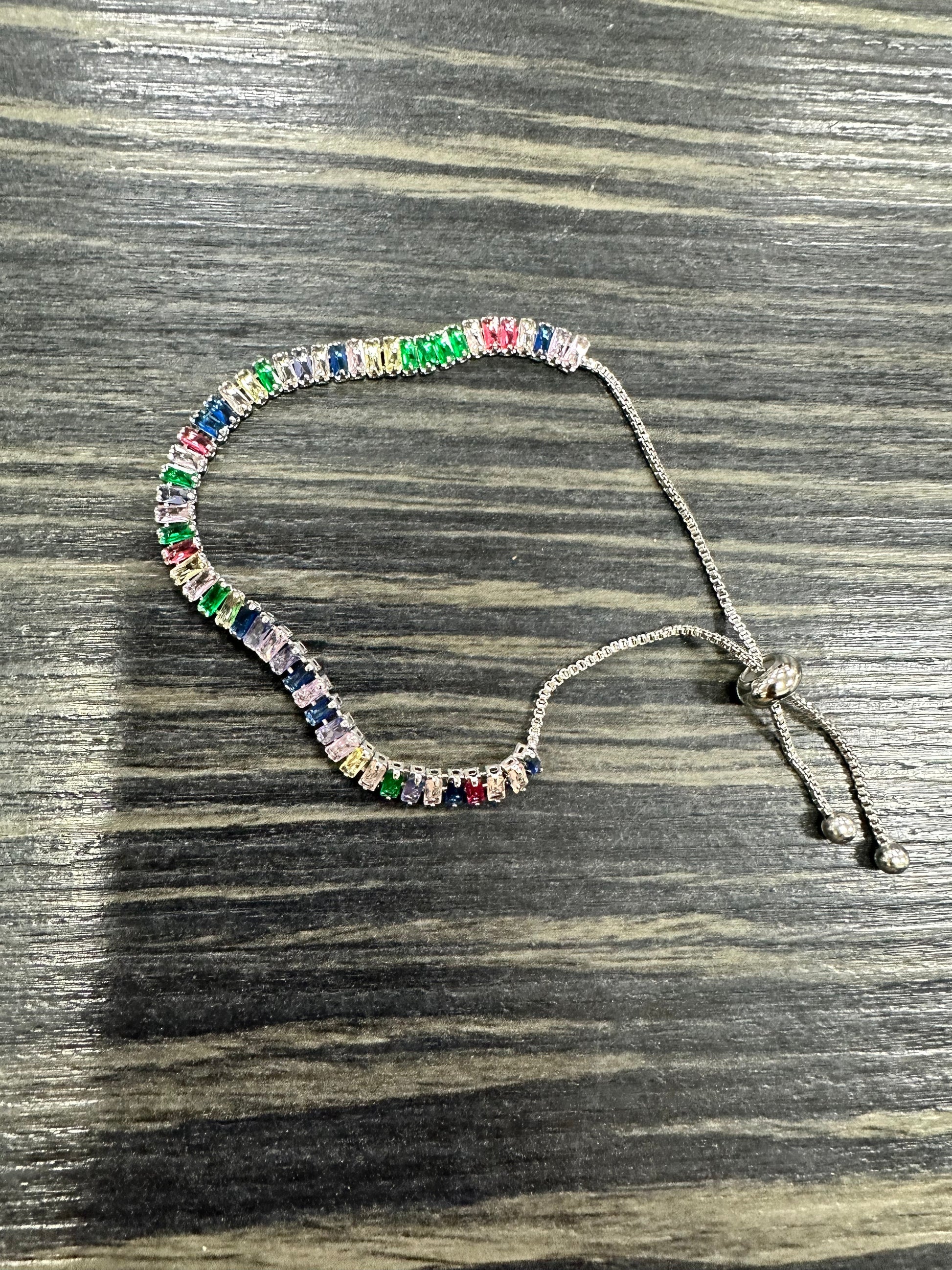 Silver tone bracelet set with multicoloured jewels.