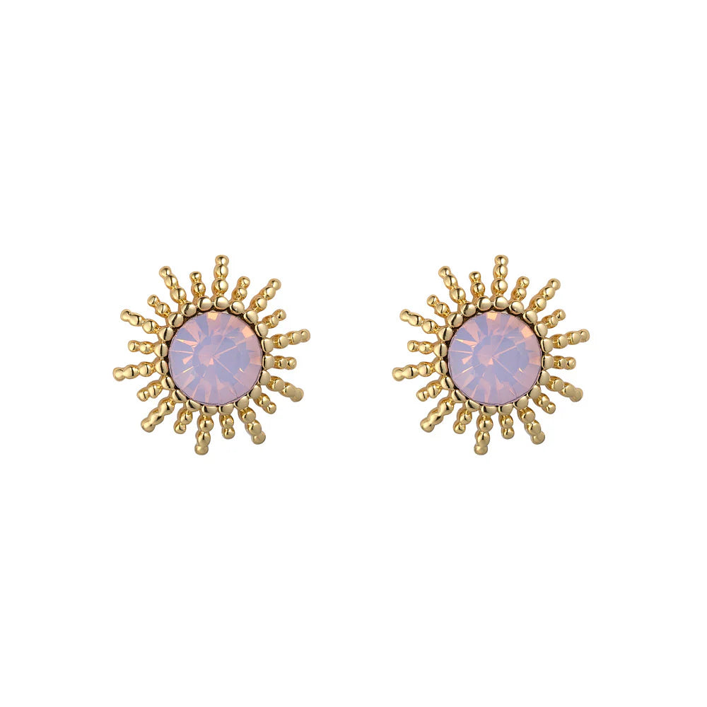 Beautiful rosewater opal crystal studs in sunburst setting. Stud fastening. Gold plating.